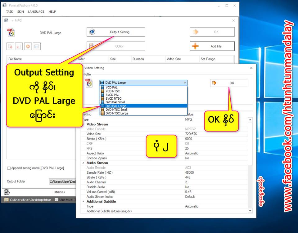 DVD စက်နဲ့ ဖွင့်ရစေဖို့ ကွန်ပြူတာကနေ Format Factory နဲ့ AVI,VOB,MPGV စတဲ့ format တစ်ခုခုပြောင်းပေးရပါတယ်။